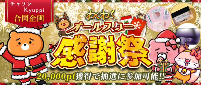 ①チャリンにおいて、イベント期間中に「チャット・音声通話・ビデオ通話」で合計20,000pt以上獲得すること。